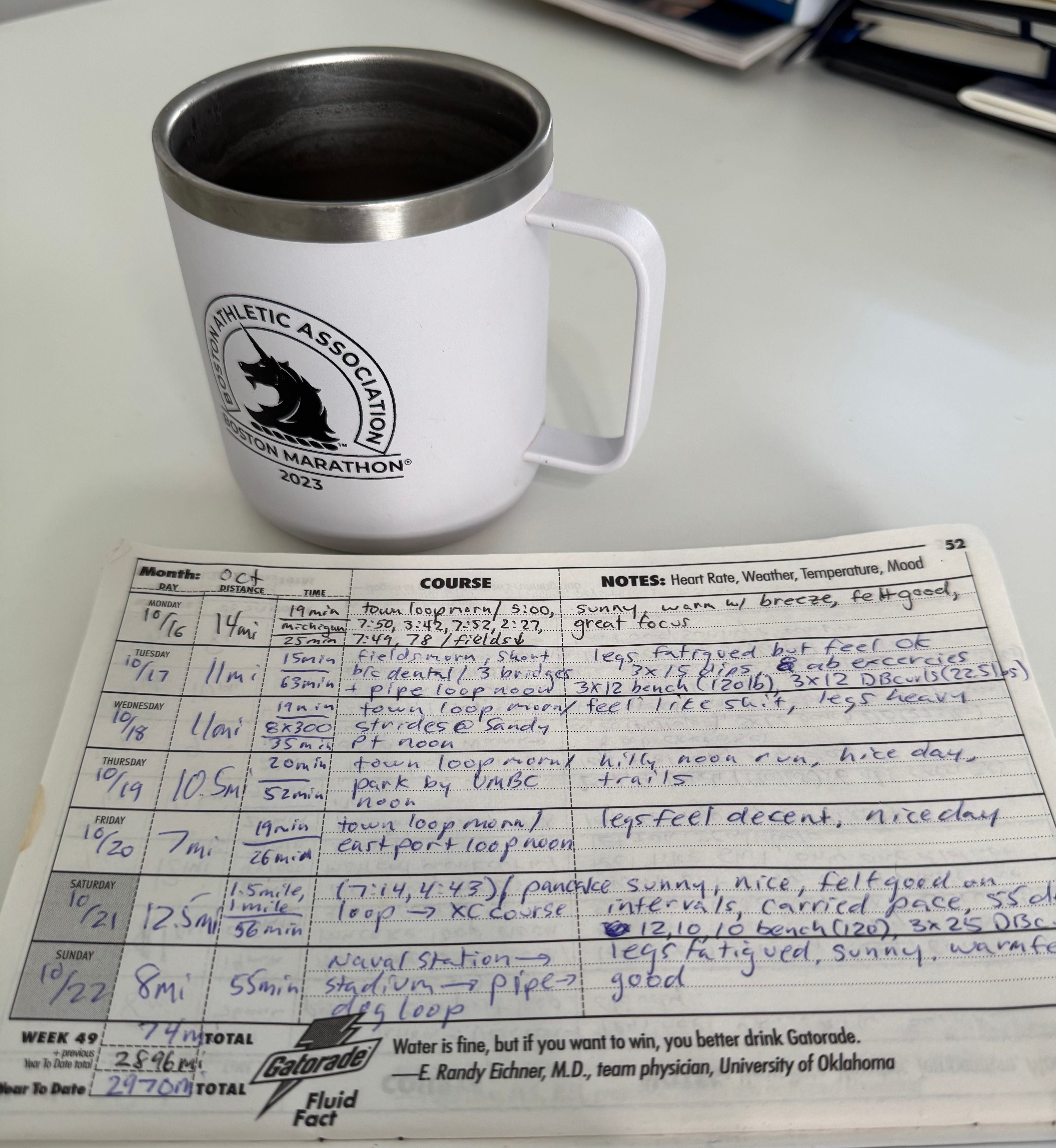 I sat there reading these old logs, reminiscing about my college runs. The journals reveal good days and shitty days, runs both mundane and noteworthy, and running locales familiar and forgotten. The notes from October 16, 2000 state: “sunny, warm w/ breeze, felt good, great focus.” Are these scribbles all that’s left of the last time I completed The Michigan at Navy?